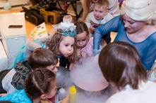 Сказочное погружение в волшебную страну пузырей. Фокусы и трюки с мыльными пузырями. В завершение программы погружение в гигантский мыльный пузырь.